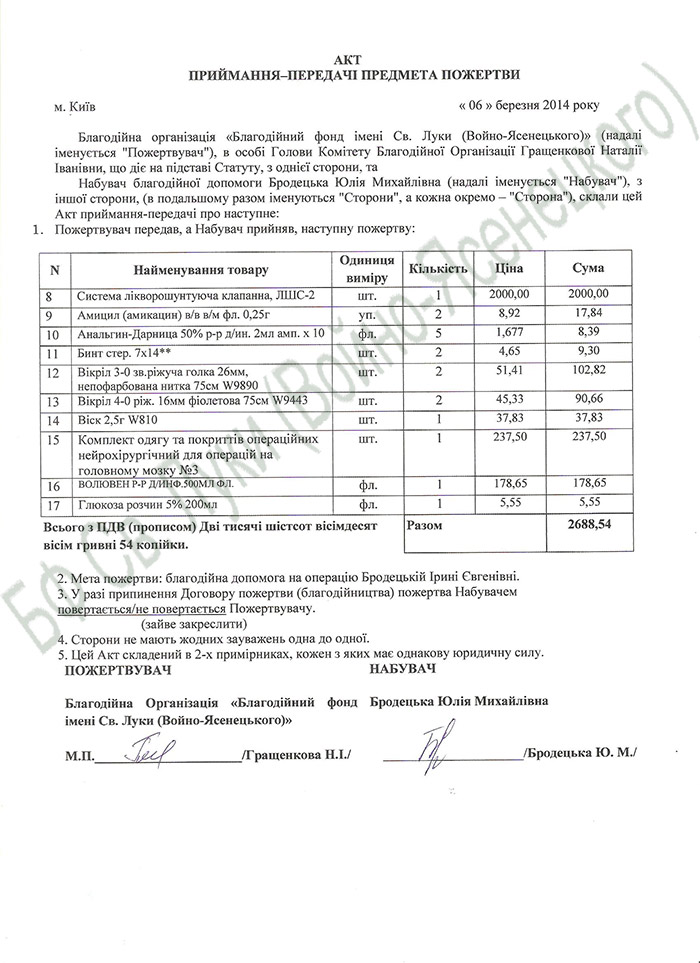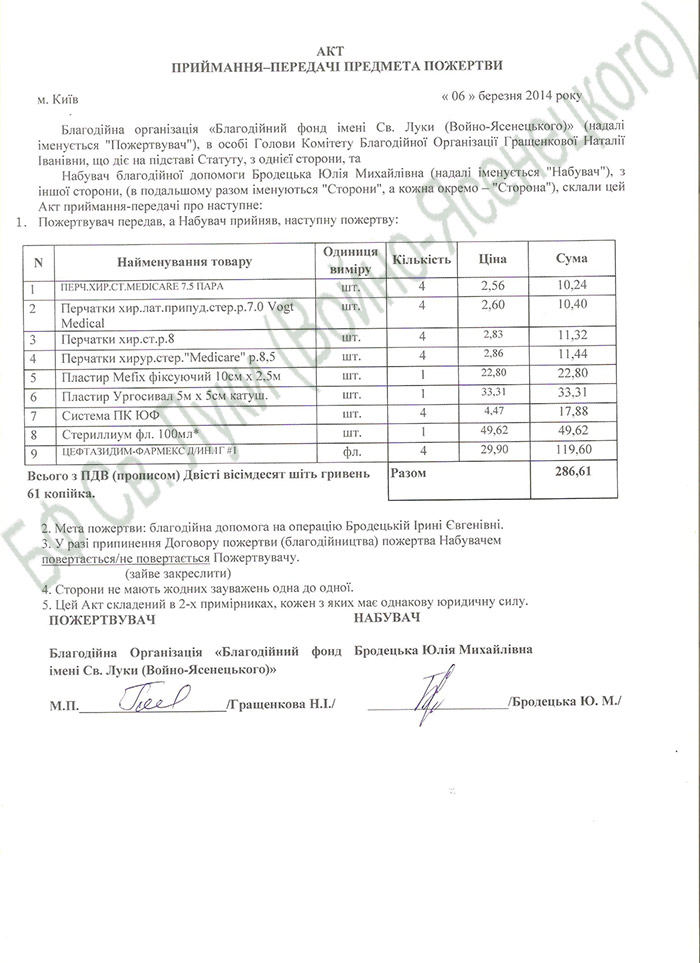 20.03.2014 – 12:42:00 – 149,00 UAH – Благотворительный взнос без НДС обеспечение лечения Бродецкой И. Пл-щик: ДУБРОВА ОКСАНА СТАНИСЛАВОВНА