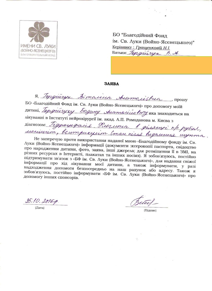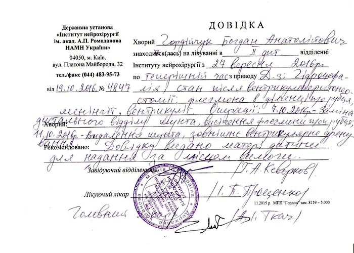 Лечение очень дорогое и у семьи нет таких средств. Благодаря своим друзьям и знакомым они оплатили первые 1,5 месяца лечения и собрали сумму на новый шунт – это 35 тысяч гривен. Но еще необходимы антибиотикотерапия и расходники на операцию. Предварительно, для лечения ребенка надо еще 15 тыс. гривен.