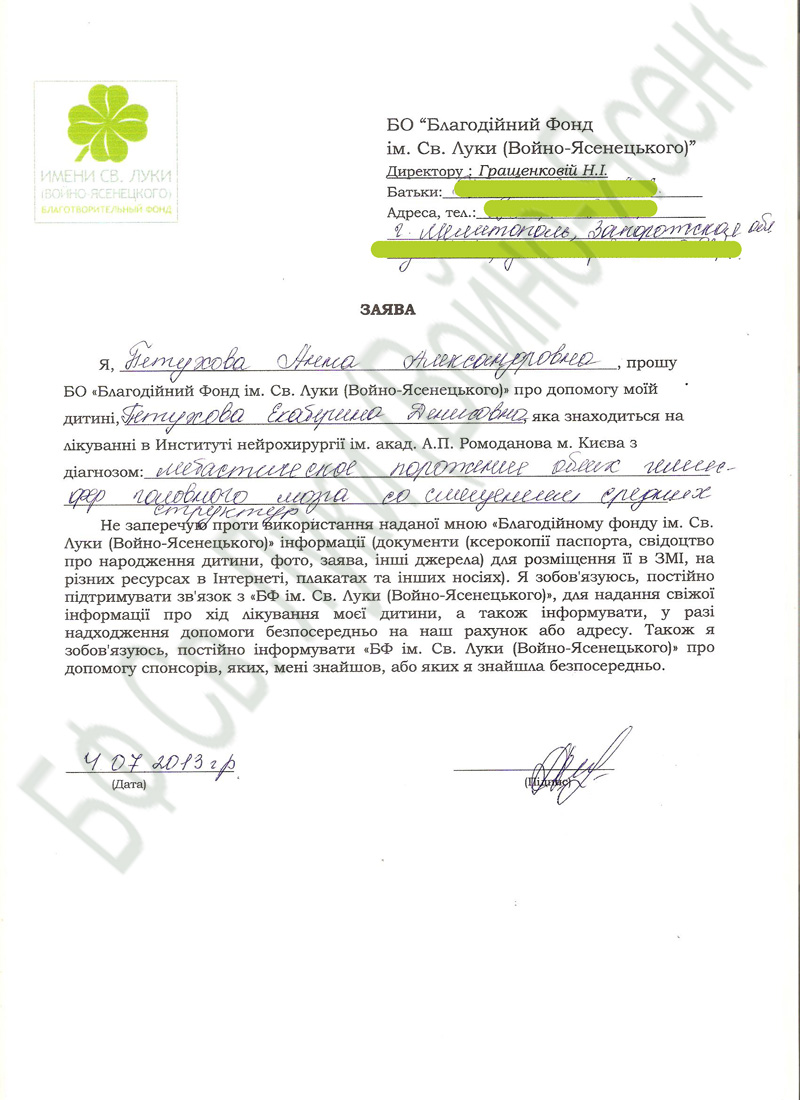For chemical therapy Katya was sent to a regional children hospital. We are waiting for a confirmation from one of the charity funds of Zaorozhye that they will supervise Katya. After that all remaining finances will be transferred to their accounts.