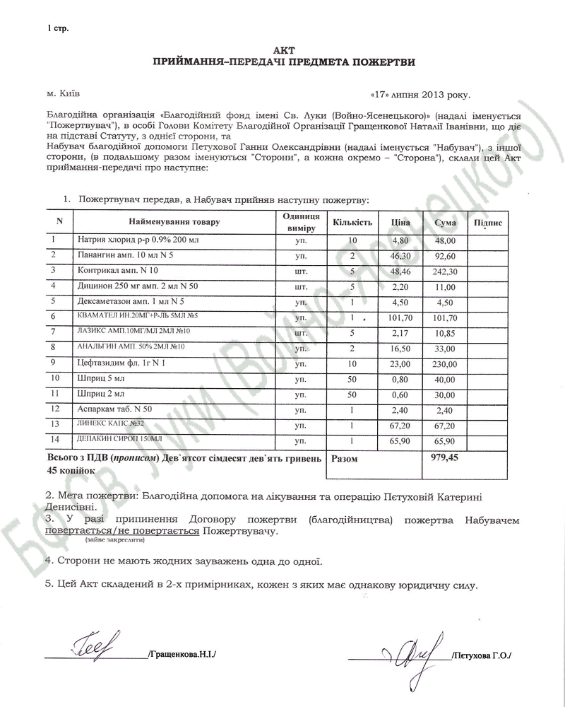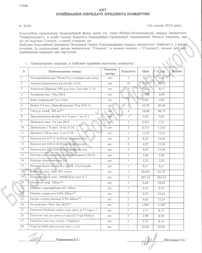 31.07.2013 – 300,00 – Благотворительный взнос на лечение Петуховой К. – ФОП Кравченко В. В.