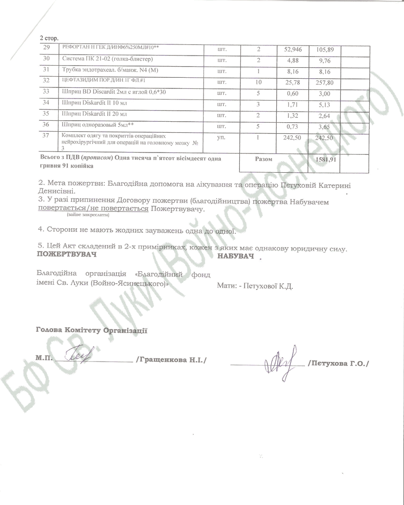 в ПАТ “Райффайзен Банк Аваль”, МФО 380805, код ЄДРПОУ 37935873 БФ ІМ. СВ. ЛУКИ (ВОЙНО-ЯСЕНЕЦЬКОГО) р/р № 26009359761 (грн) (Обеспечение лечения – Kate Petuhova) в ПАТ “Приватбанк”, МФО 320649, код ЄДРПОУ 37935873 БФ ІМ. СВ. ЛУКИ (ВОЙНО-ЯСЕНЕЦЬКОГО) р/р № 26009052612525 (грн) (Обеспечение лечения – Kate Petuhova) |