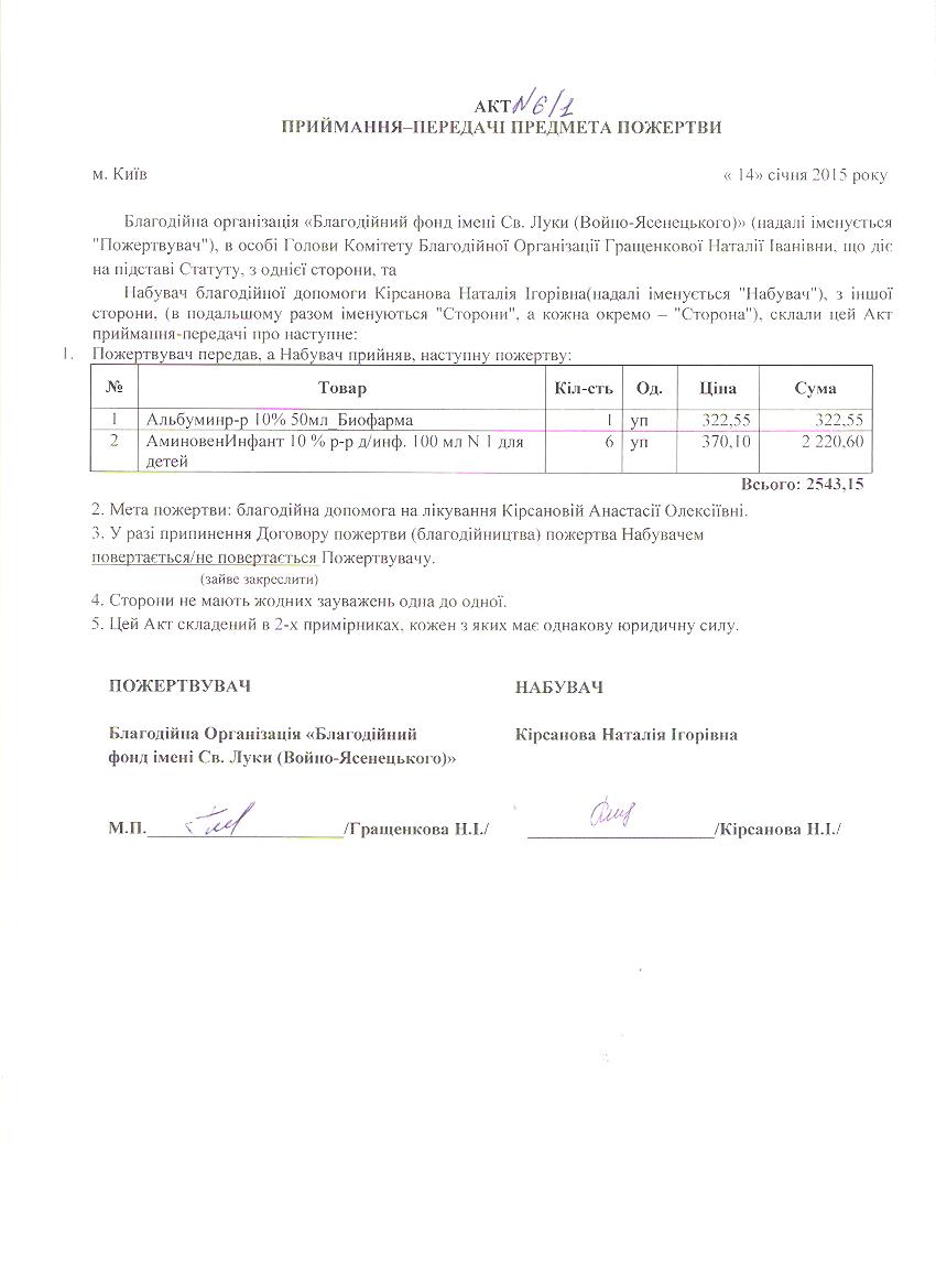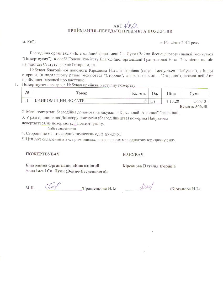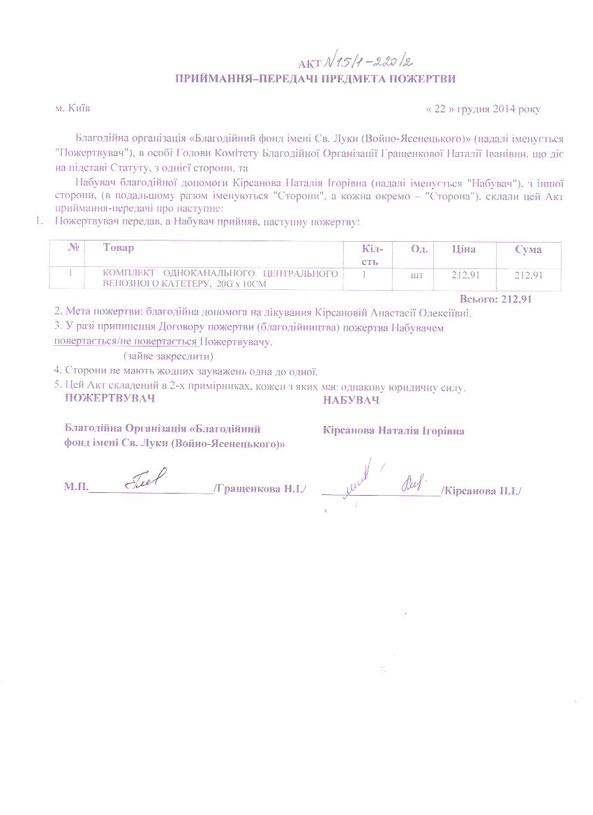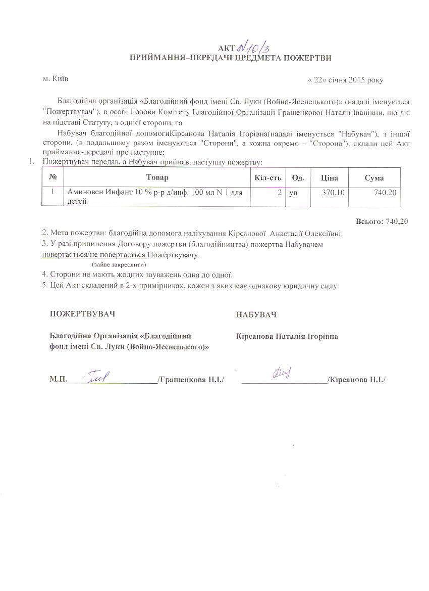13.01.2015 14:02:00 – 300,00 UAH – Благодiйний внесок згiдно листа вiд 12.01.2015.Без ПДВ.Забезпечення лiкування- Кiрсанова Настя.