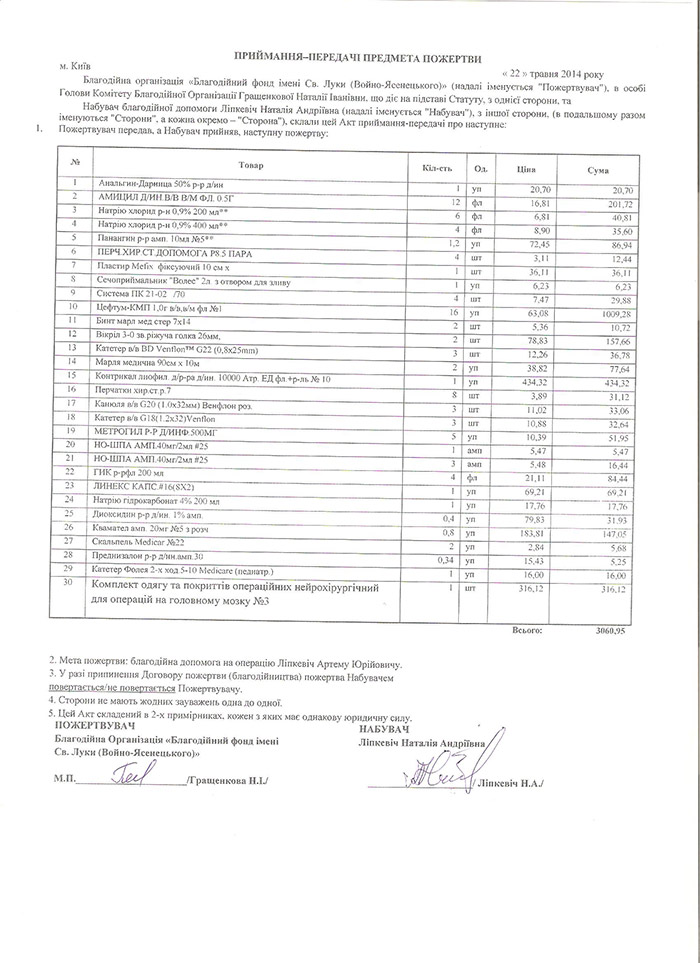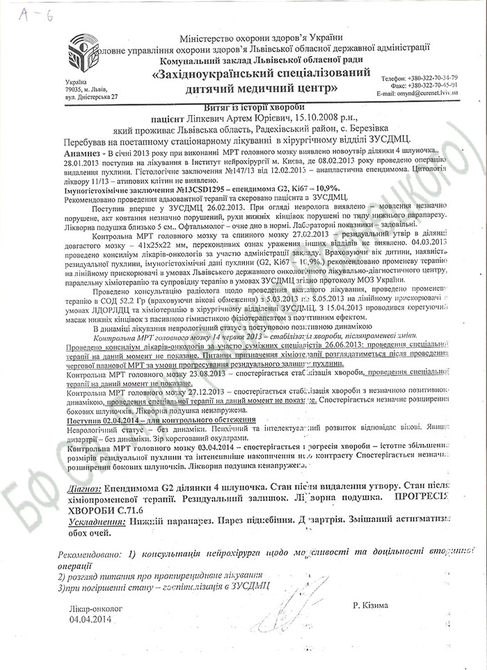19.05.2014 06:22:00 – 135.00 UAH – Артем Липкевич, 5 лет, опухоль Пл-щик: ДУДУЛАД АННА ВАЛЕНТИНОВНА