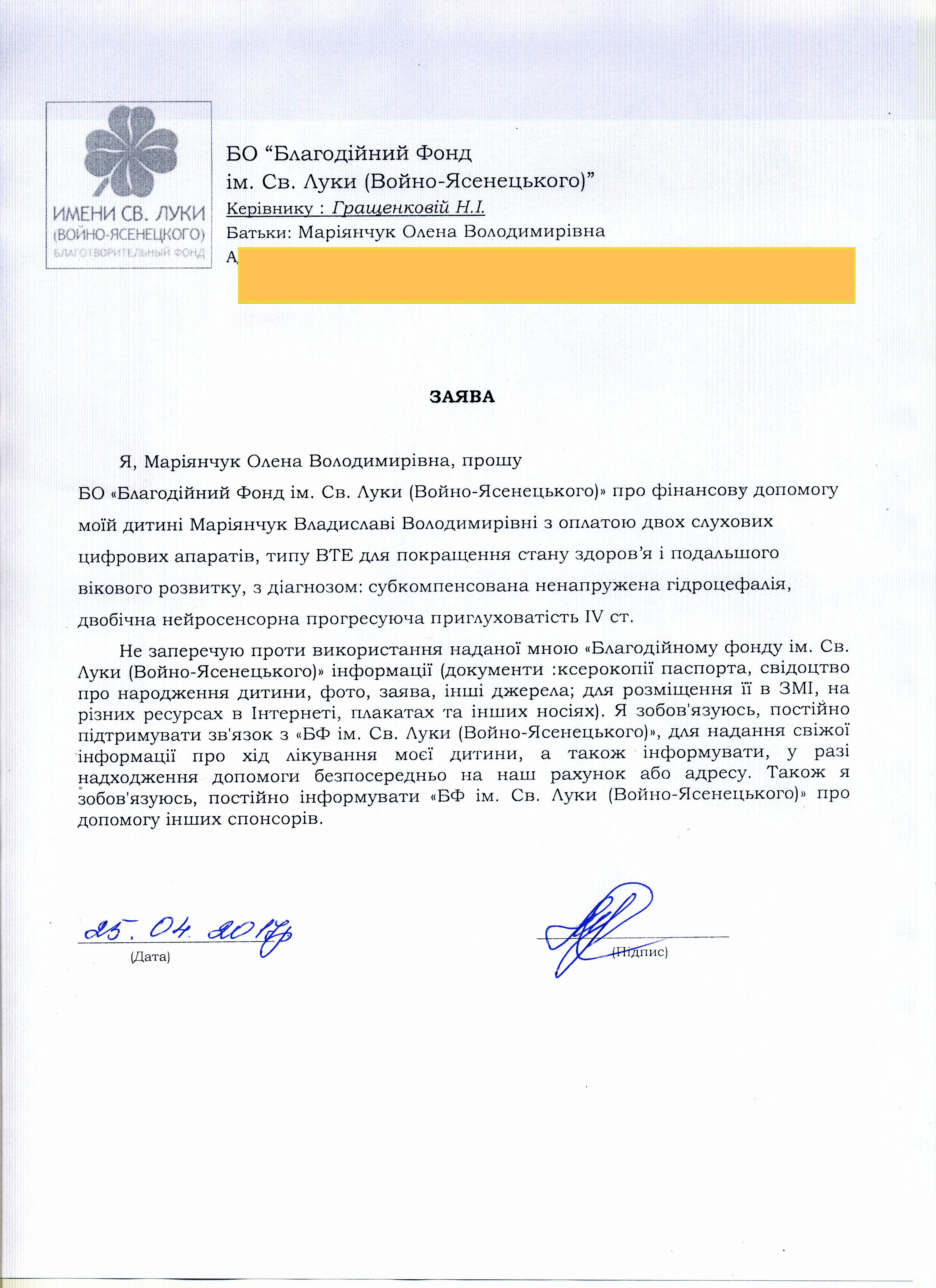 Благотворительный взнос без НДС на лечение Марьянчук Владиславы