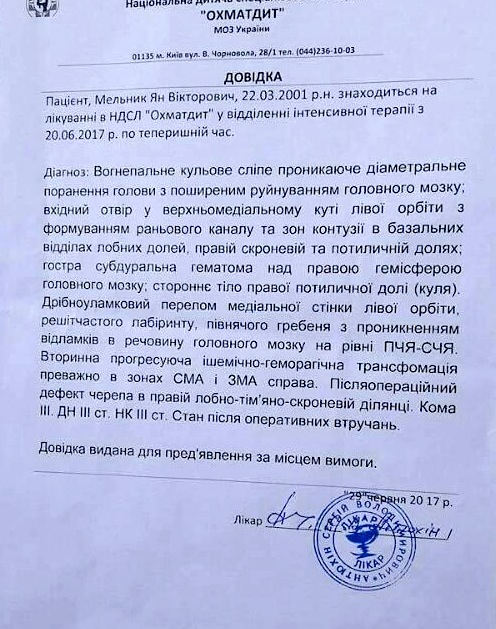 Переведен. Мельник Ян, 16 лет, огнестрельное ранение в голову
