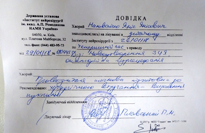 Поступления на лечение Наливайко Яниса