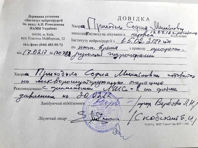 Поступления на лечение Приходько Софии