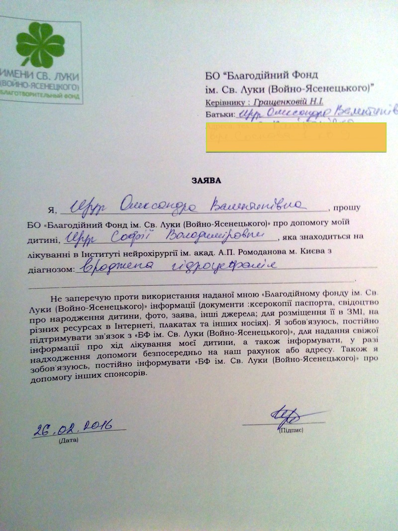 Девочка родилась преждевременно, на 7-м месяце. Беременность протекала хорошо, этого никто не ожидал. В результате кровоизлияния в родах у малышки появилась гидроцефалия. В конце прошлой недели ее доставили из областной больницы в Институт Нейрохирургии. Операция назначена на завтра. Стоимость шунта и материалов составляет порядка 20 тысяч гривен.