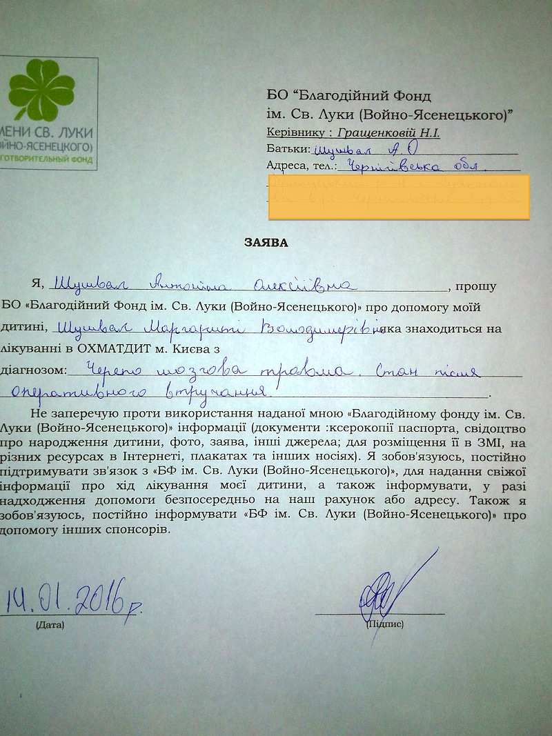 Благотворительный взнос без НДС на лечение Шушвал Маргариты