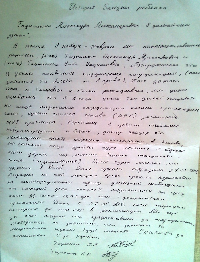 Расходы на лечение Тацишиной Саши