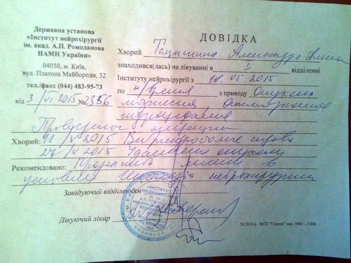 Поступления на лечение Тацишиной Александры