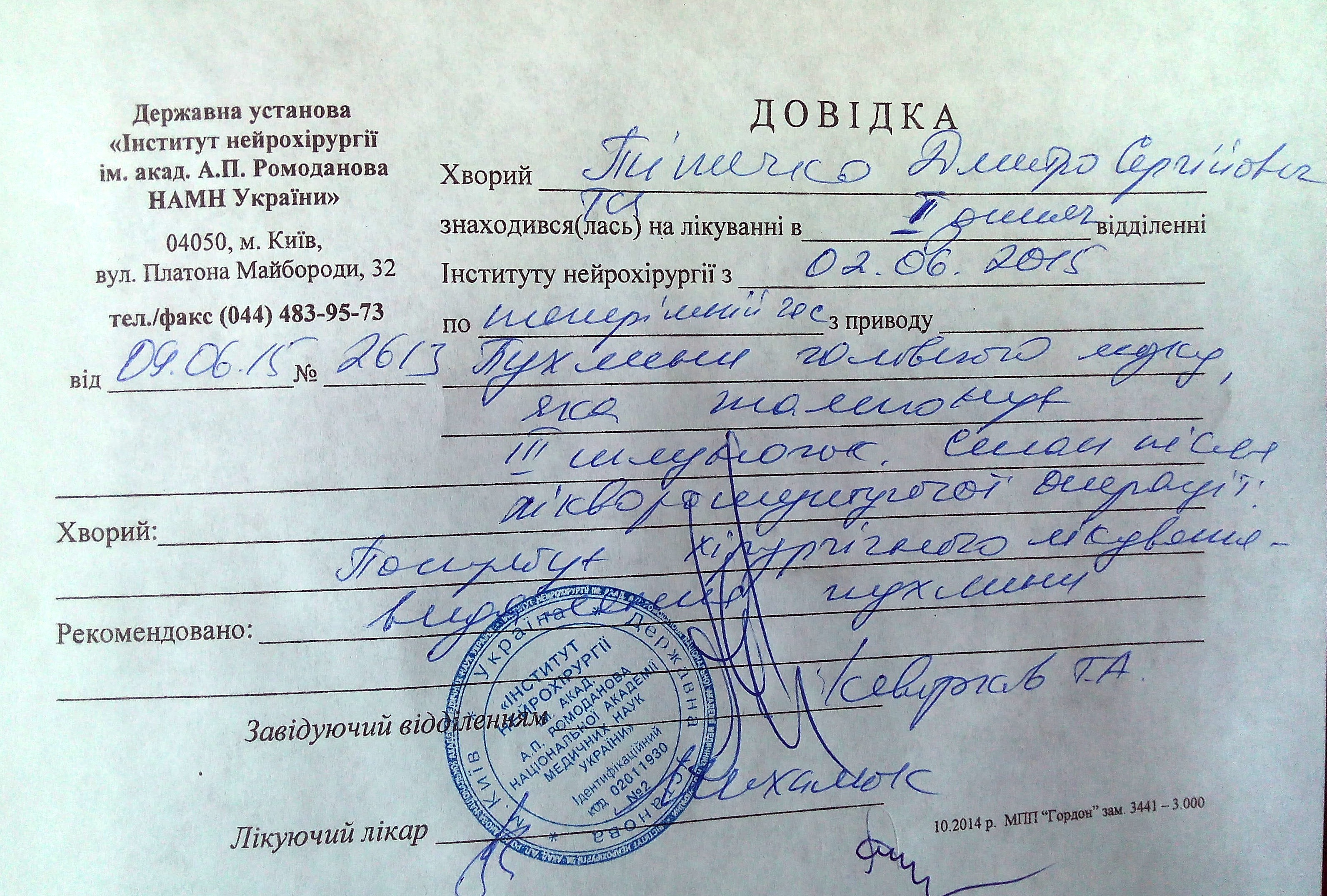 Поступления на лечение Титечко Димы