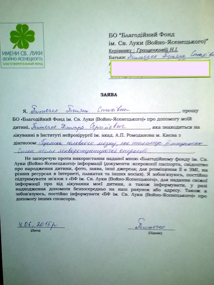 Благотворительный взнос без НДС на лечение Титечко Димы