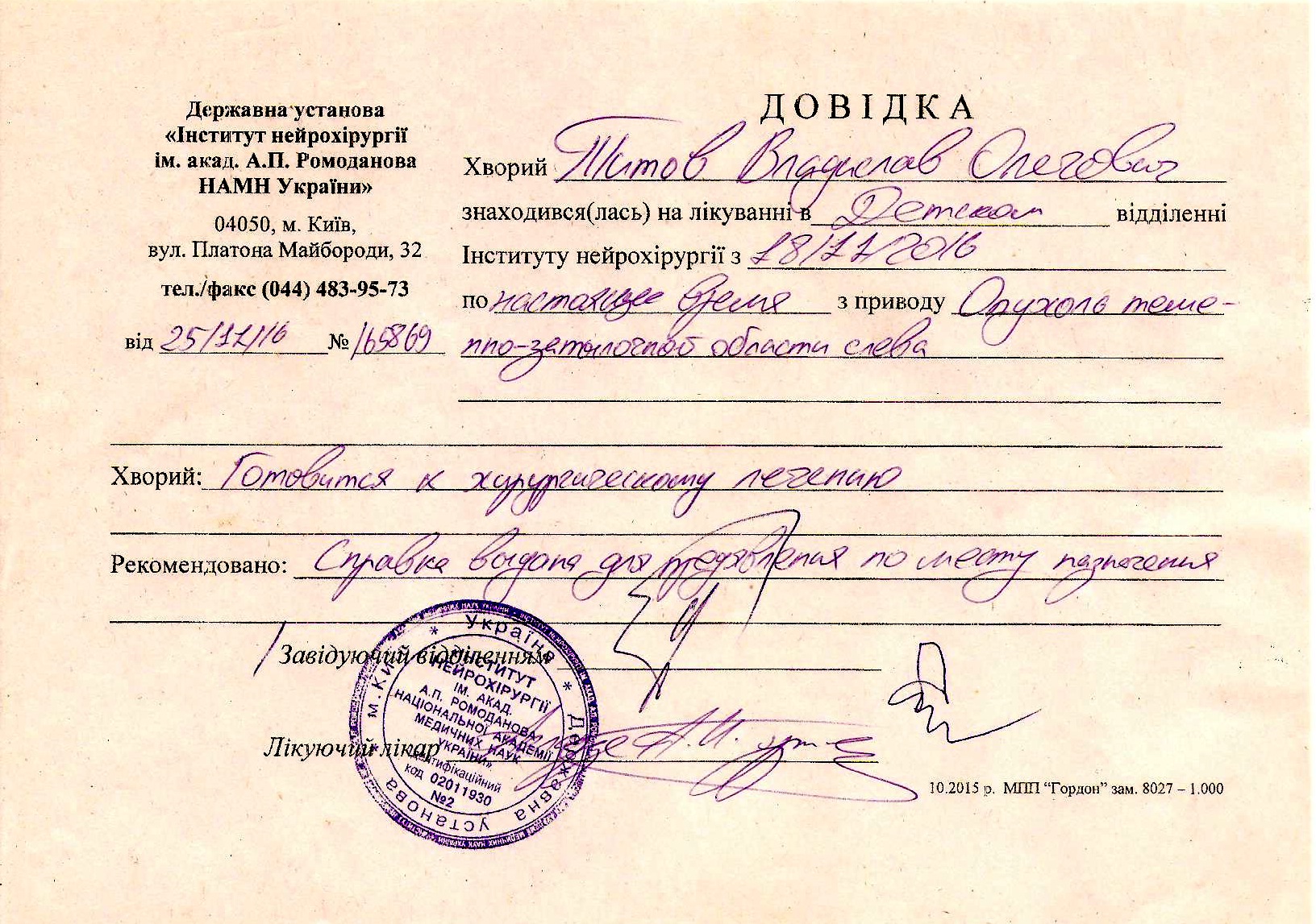 В ноябре 2016 года состояние Владика вдруг резко стало ухудшаться. Сделали ему МРТ. На следующий же день, ничего не объяснив толком родителям, ребенка срочно направили в Киевский Институт Нейрохирургии.